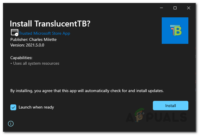 Downloading TranscluentTB from GitHub - Launch the installer file and on the pop up that appears, click the Install button.