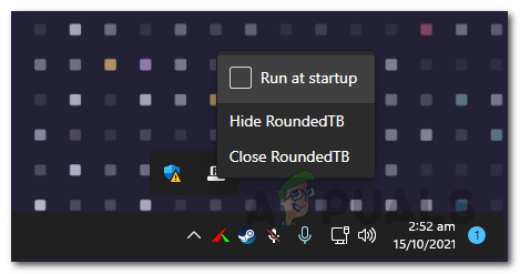 Enabling System Tray - After that, we have to make sure that the RoundedTB utility runs at startup. To do that, click on the upper arrow on your system tray and right-click on RoundedTB. From the menu that appears, make sure that the Run at startup checkbox is ticked.