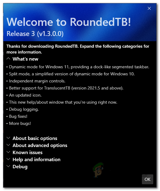 - At first, you will be shown the welcome page of RoundedTB. Click the OK button.