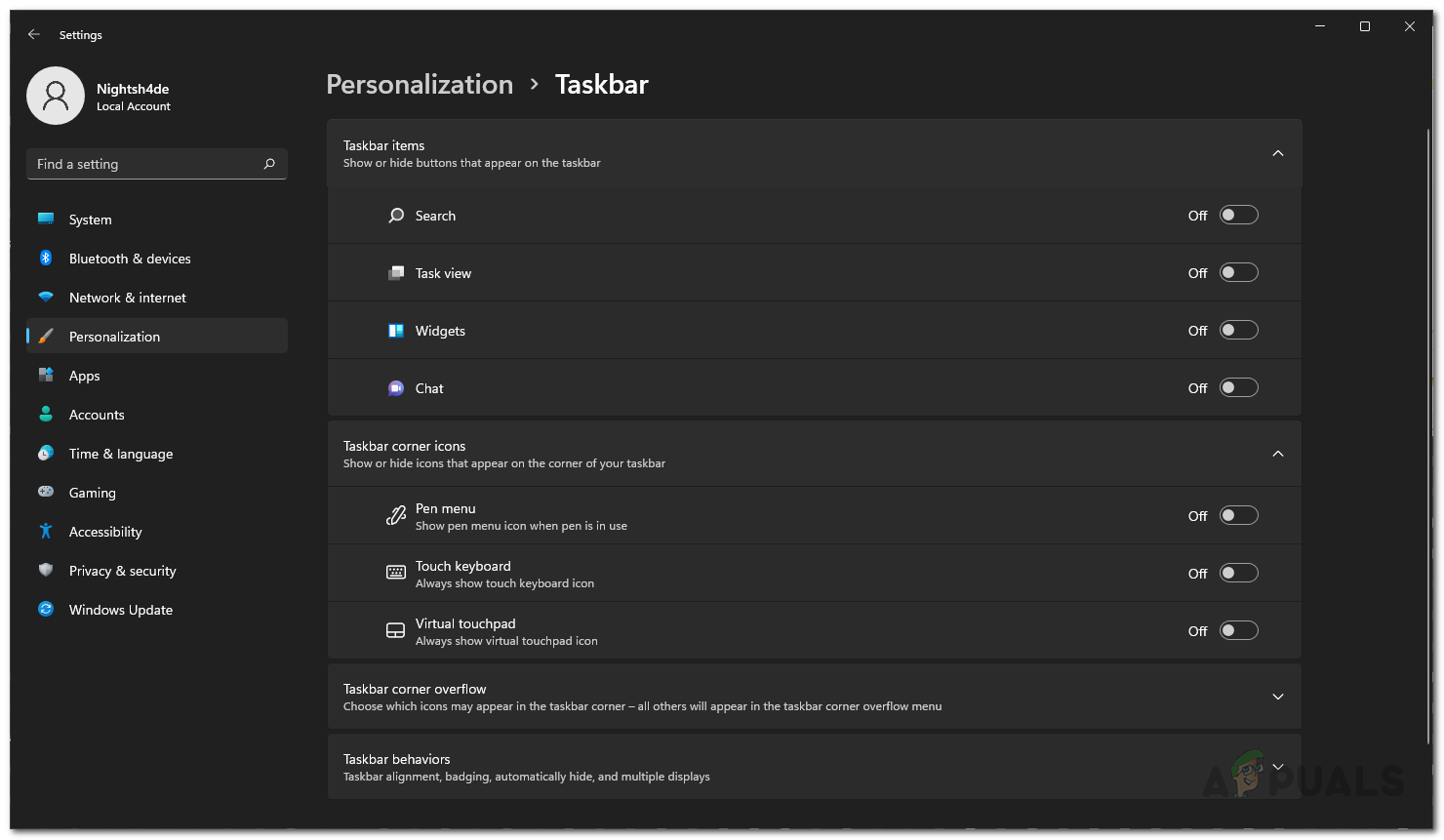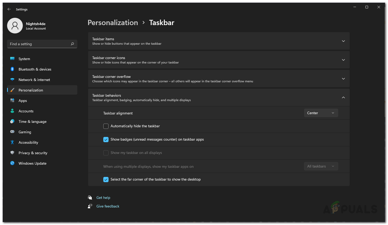 Opening up Taskbar Settings - Scroll down and expand the Taskbar behaviors option.