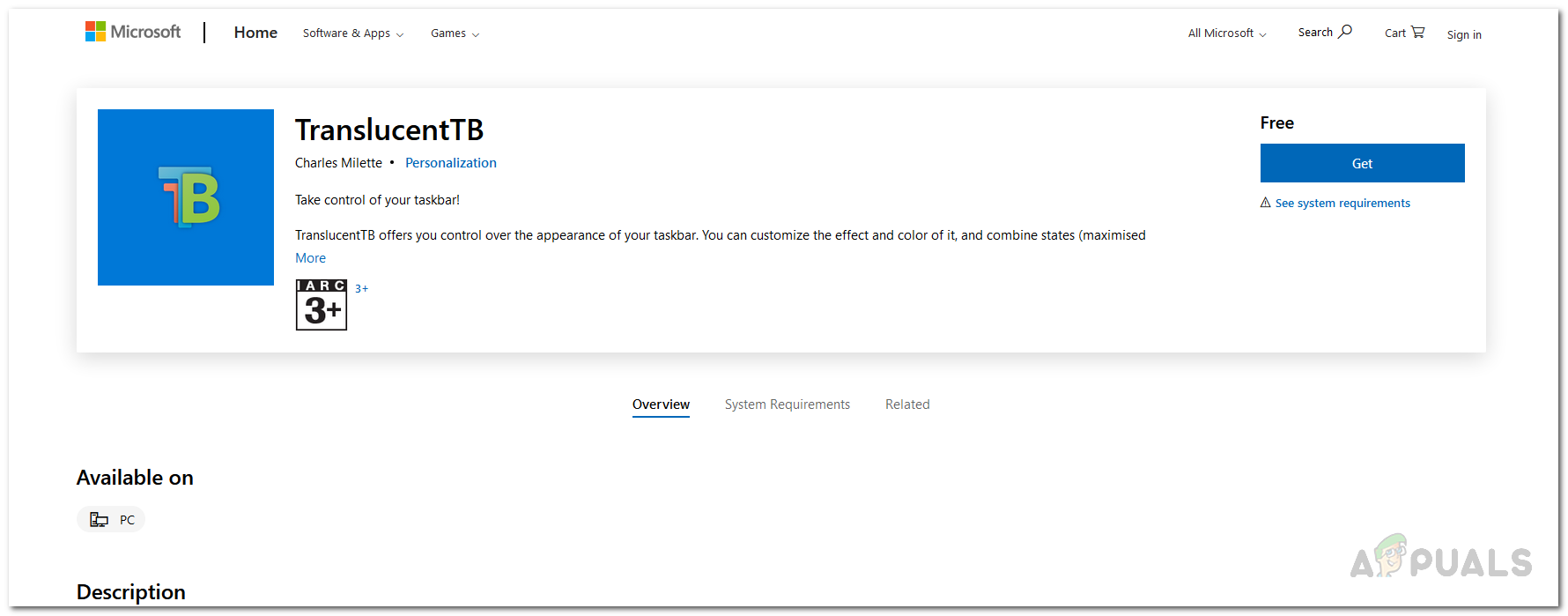 TranscluentTB on Microsoft Store - Alternatively, you can also use the GitHub repository to manually download the utility. Click this link here and download the TranslucentTB.appinstaller file.