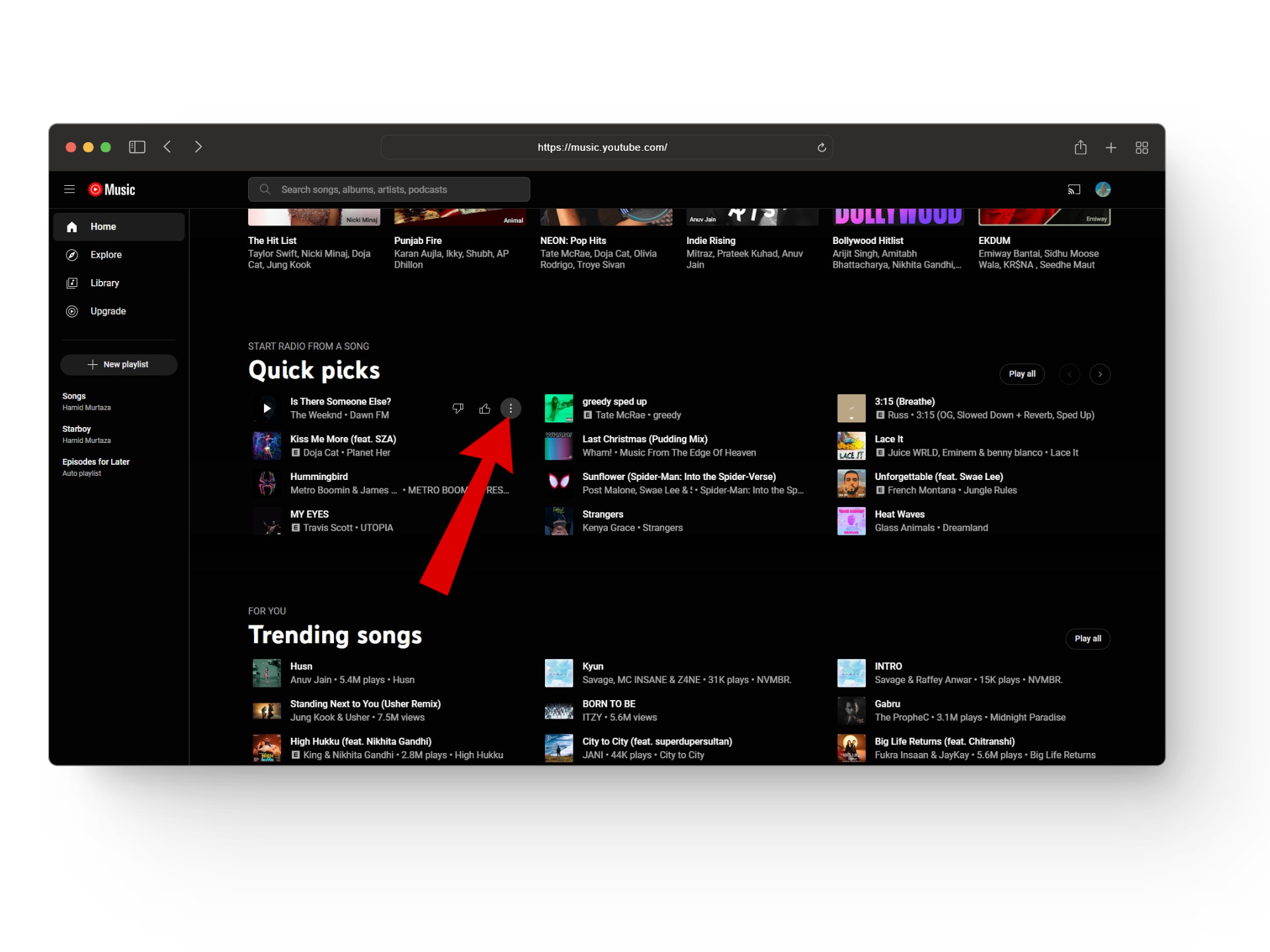 Open up YouTube Music - Next, tap on the three vertical dots next to your song to open up a menu.