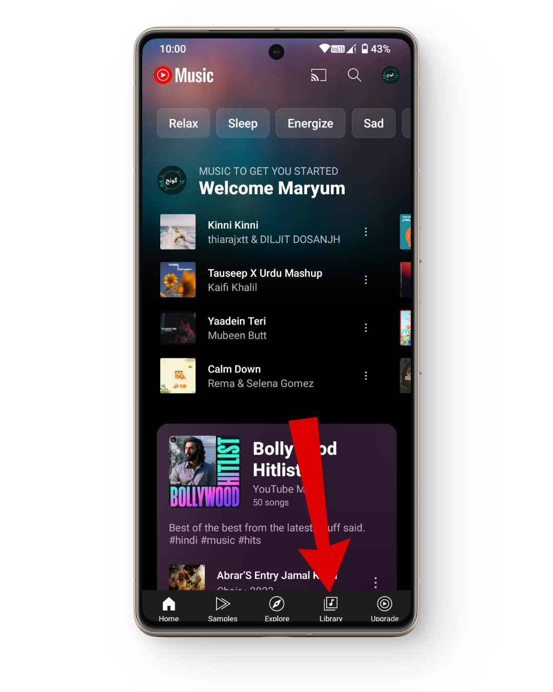 - Open up the YouTube Music app and tap on the Library tab at the bottom.