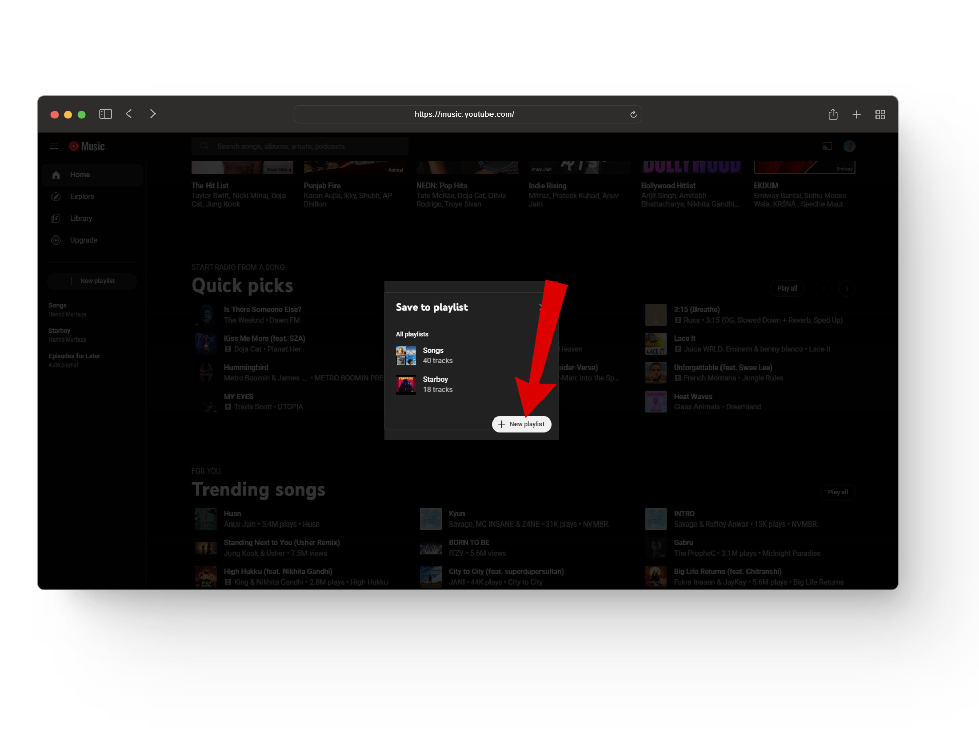 Press save to playlist - As and when you do this YouTube Music will not give you the choice to either add the song to an existing playlist or make a new one. If you want to create a new playlist from scratch click on the New playlist option.