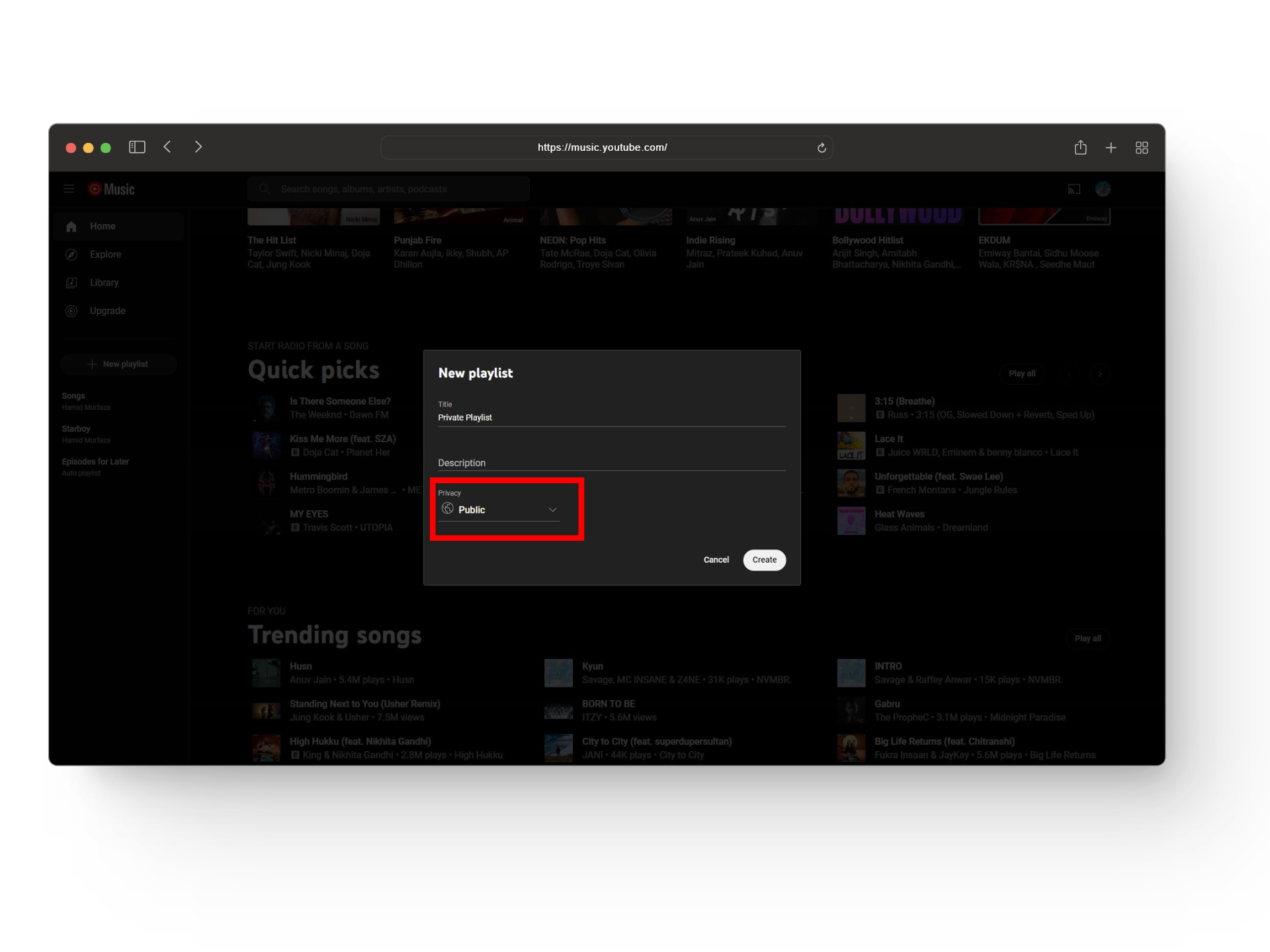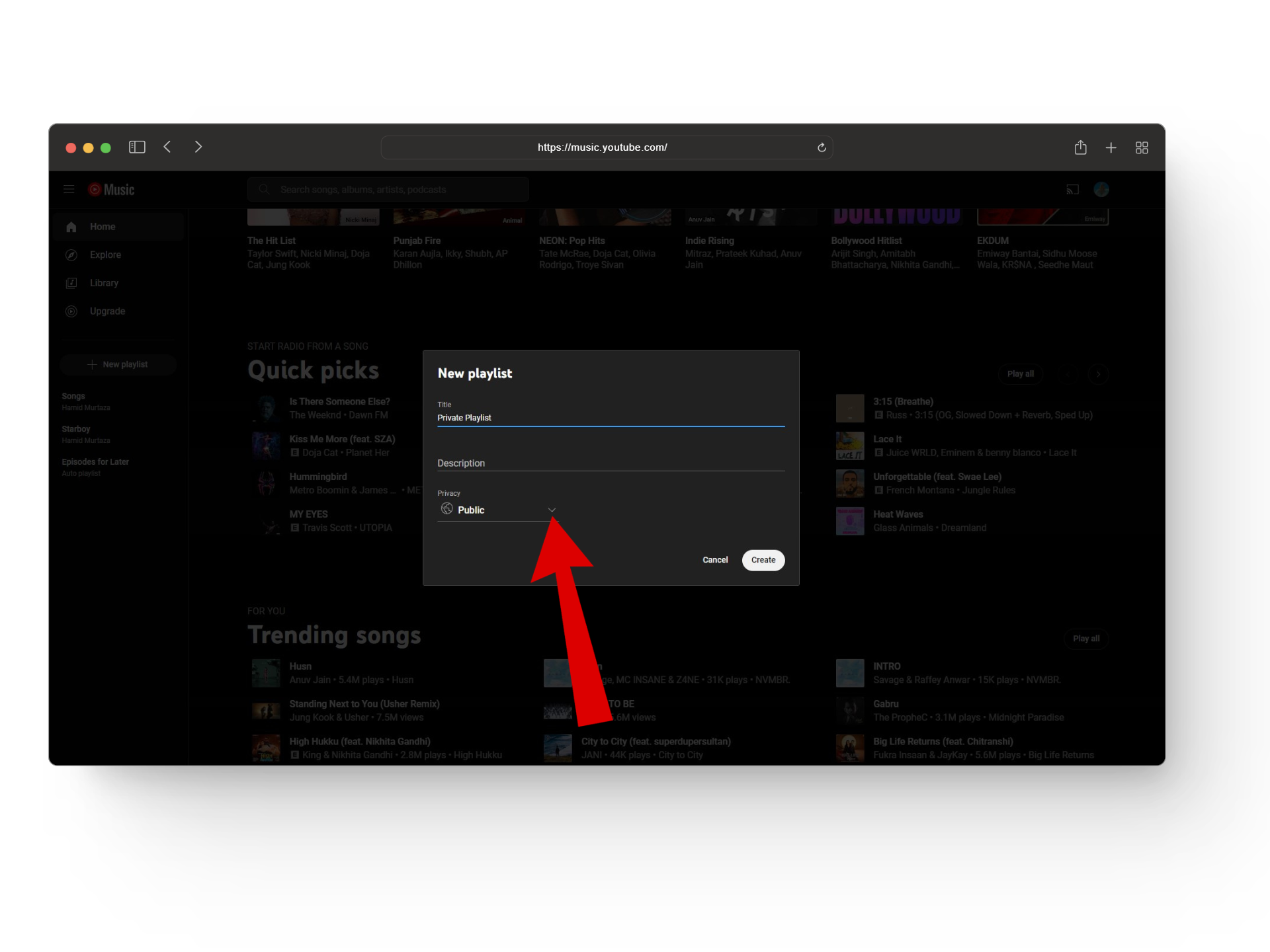 Here’s how to set privacy settings when making YouTube Music Playlists on a desktop: