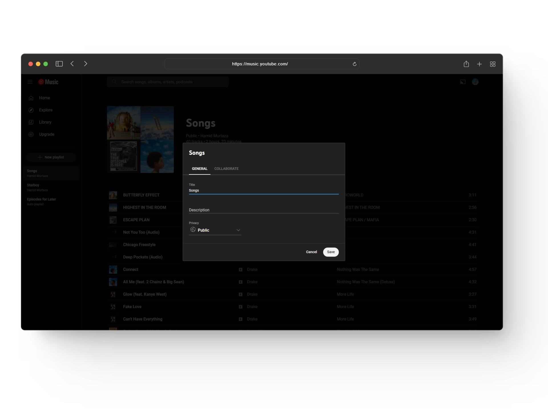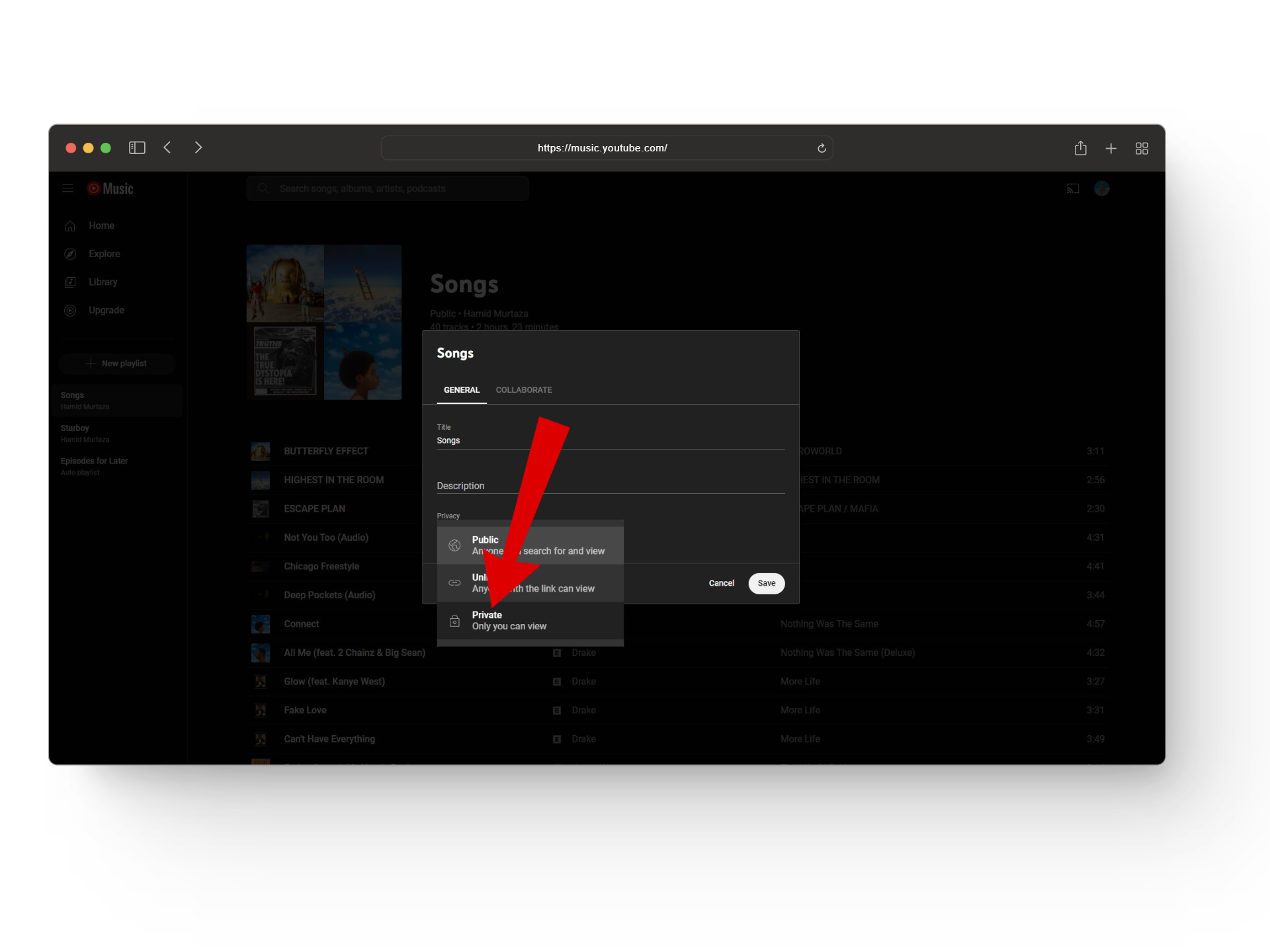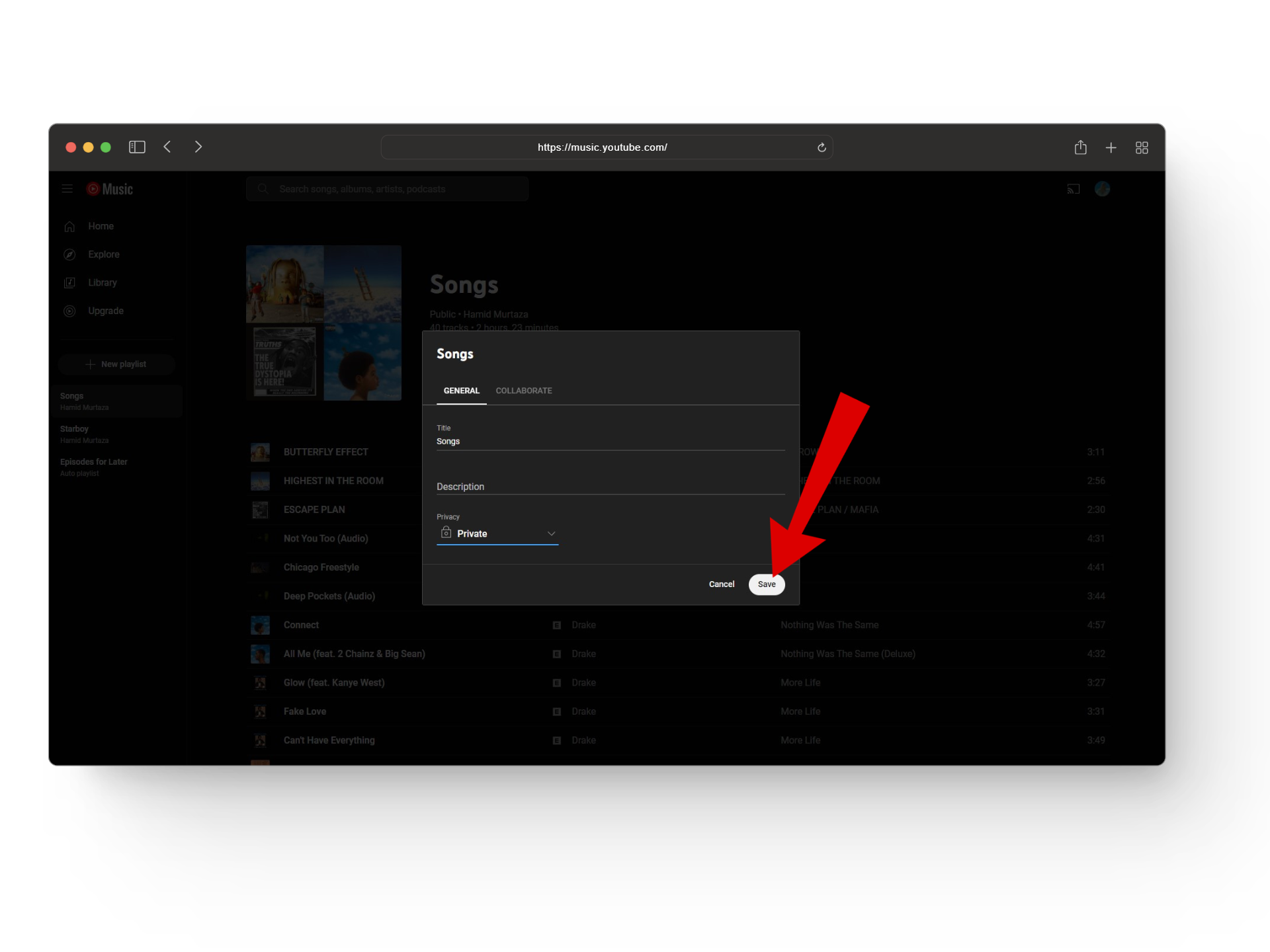Select the private option - Finally, click the Save button to make your music playlist available to yourself.