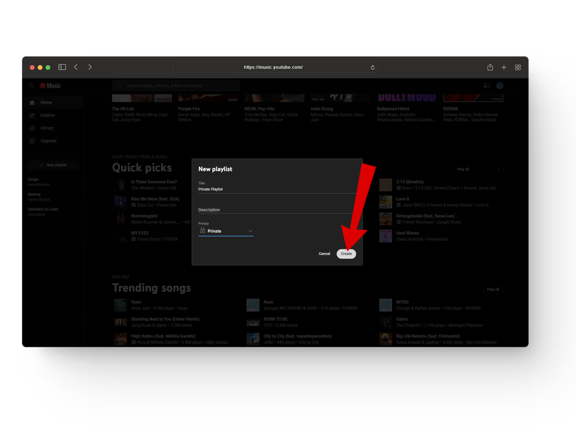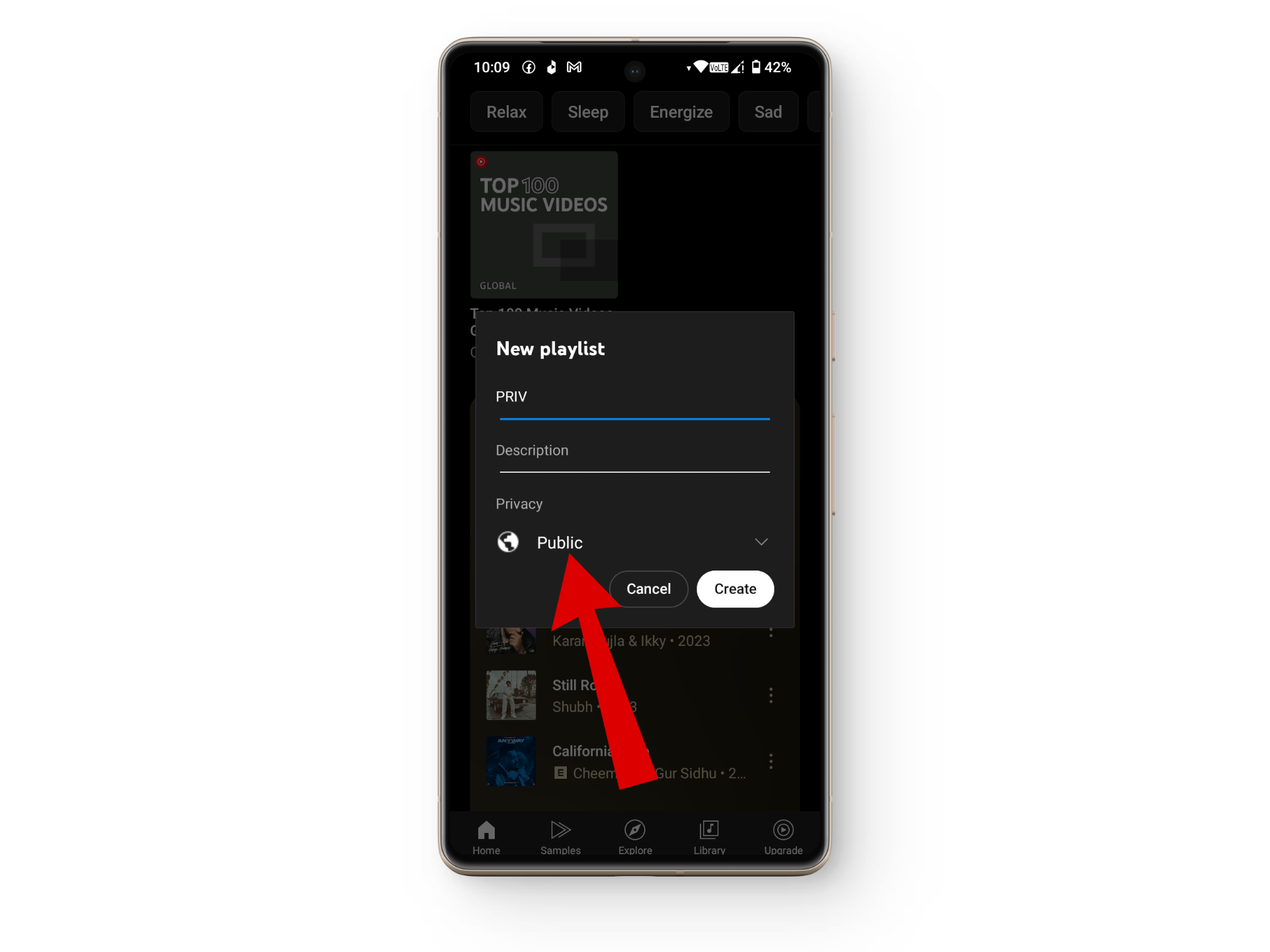 Tap on the private option - Finally, click on the Create button to finish making up a private playlist.