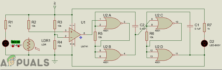 The Light Dependent Resistor plays a vital role in the circuit. It is responsible for turning ON and OFF the LED. The LDR follows the principle of photo-conductivity. The resistance of the LDR varies when light falls on it. When the light falls on LDR it’s resistance decreases and when it is placed in the dark it’s resistance increases. Hence, the switching of the LED depends on the resistance of the LDR. Before reading this article it is highly recommended to read the table of logic gates of NOR. It can be googled or found Here. The Operational Amplifier 741, NOR Gate CD4001 and LDR are the backbones of the circuit. The LDR and the LED will be installed at the opening of the letter-box so that the light from the LED keeps on falling on the LDR. Hence, the OpAmp 741 will be HIGH. That signal is provided to the Pin1 of CD4001 and this NOR Gate produces the HIGH output when all of the inputs are low. Hence, the LED keeps on glowing when there is no letter in the letter-box. As soon as the letter is dropped in the box the resistance of LDR becomes very HIGH and the output of LM741 becomes LOW. This LOW signal is further provided to CD4001 that will result in (0) output at pin 3 of NOR Gate. This will generate the HIGH (1) on pin4. This is due to the inputs that are given to the second gate from pin 3 and it can be seen below in the circuit that both inputs are (0) hence the output at pin 4 will be HIGH. Due to all of the operations happening above the output at pin 11 will be HIGH and the LED stops glowing and it will indicate that there is a letter in the box. The LED stays OFF until the letters are taken out of the box and LED starts glowing again.