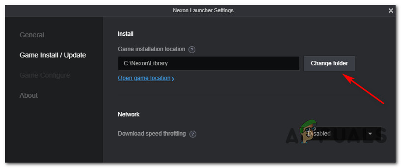 Accessing the launcher settings menu - Once you return back to the Nexon Launcher Settings menu, click on Game Install / Update tab from the vertical menu on the left, then click on the Change folder button associated with the Game Installation location.