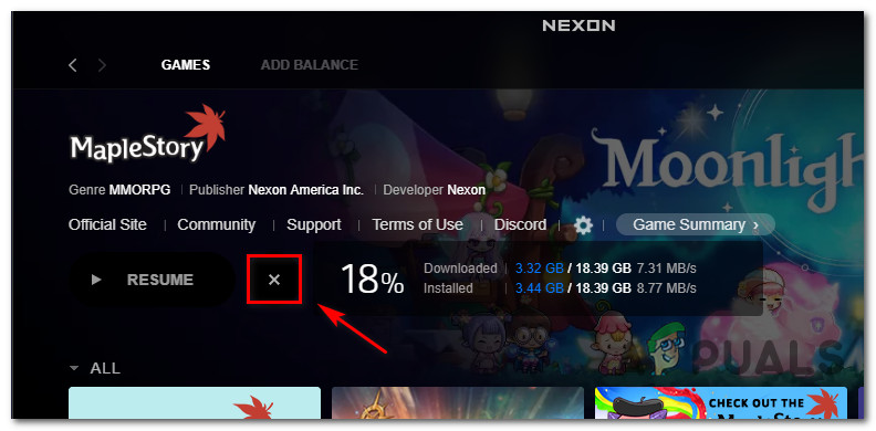 Renaming the main MapleStory folder - Once the folder has been renamed, open the Nexon launcher once again, click on MapleStory, then click on Play. Since you renamed the folder, the launcher will no longer see the game so it will begin downloading it again. When this happens, click on the pause icon, then click on the X button to cancel the download.