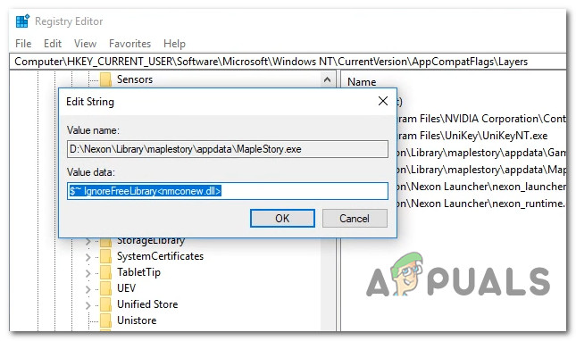 Several affected users that we’re encountering the same type of error have reported that the issue was finally resolved after they used the Registry Editor utility to navigate to the location of this problematic layer and deleting the value associated with MapleStory.exe.