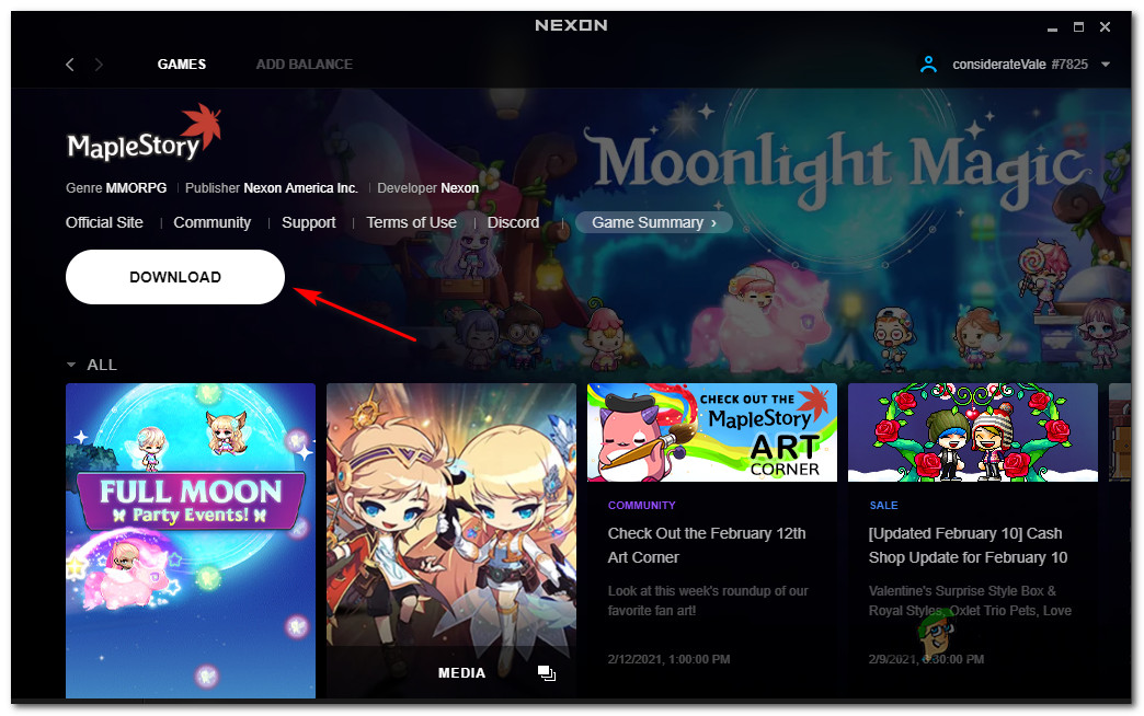 - Return to the main interface of the Nexon launcher, access the listings associated with MapleStory, and click on the Download button again to initiate the download of the game once again.