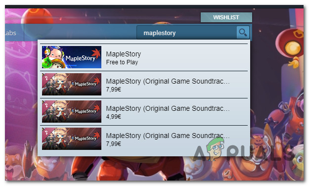 Searching for the MapleStory listing in Steam - From the list of results, click on the Free to Play listing of MapleStory, then click on the Play Game button.