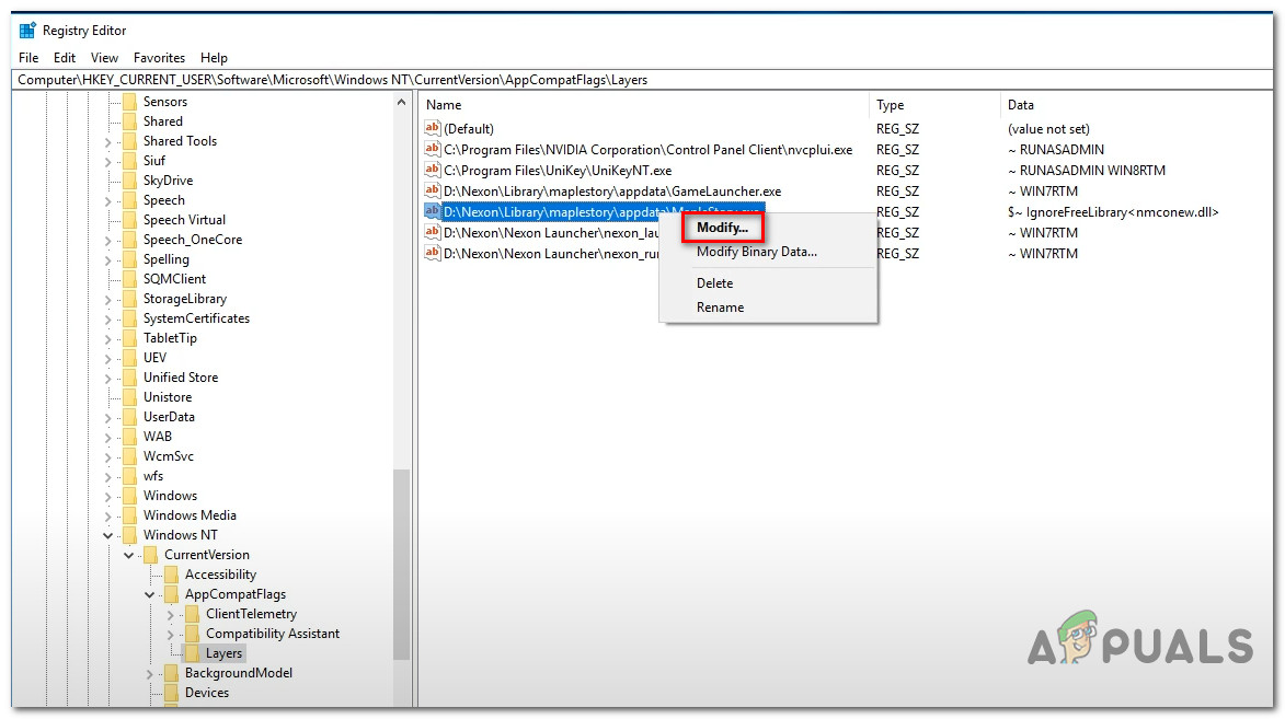 - Corrupted compatibility layers value in Registry – As it turns out, a registry key that is taken with facilitating the rendering of the game in compatibility mode is open responsible for causing the issue on Windows 10. If this scenario is applicable, you can fix the issue by using the Registry Editor to clear the value of the AppCompatFlags associated with the main MapleStory executable.
