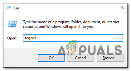 - Press Windows key + R to open up a Run dialog box. When prompted by the text box, type ‘regedit’ and press Ctrl + Shift + Enter to open up the Registry Editor utility with admin access.