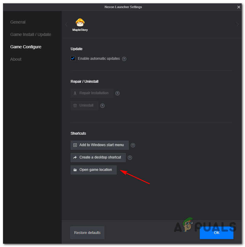Note: If you installed the game in a custom location but you can’t remember it, open up the Nexon launcher, click on the gear icon, then click on Open game location from the Game Configure menu.