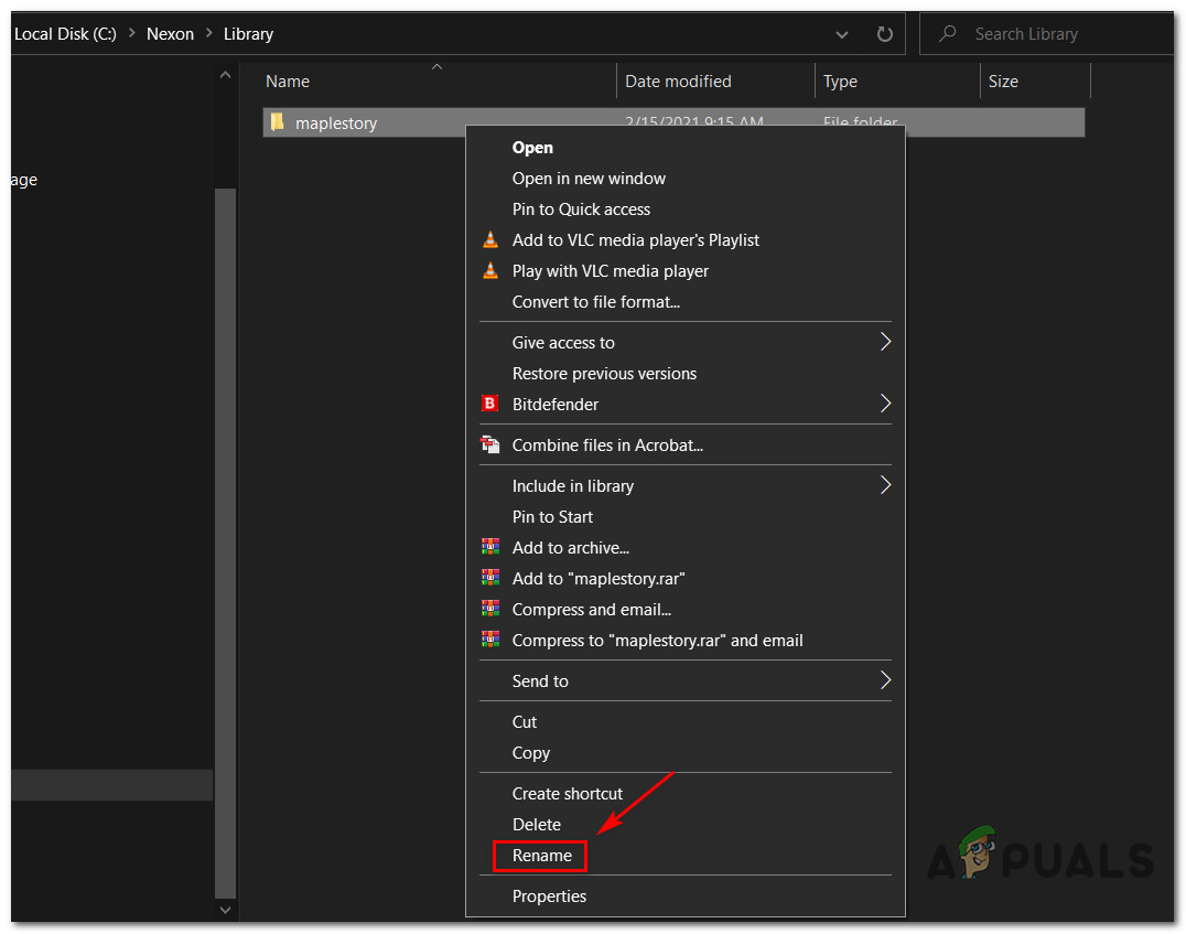 According to some affected users, you might also be able to fix this particular issue by accessing the main location where you installed the game and renaming the main game folder (Maplestory) to a different name.
