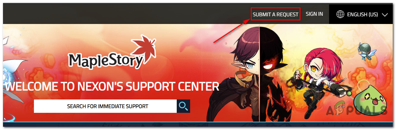 - Visit the official support page of MapleStory and click on Submit a Request from the top-right corner of the screen.
