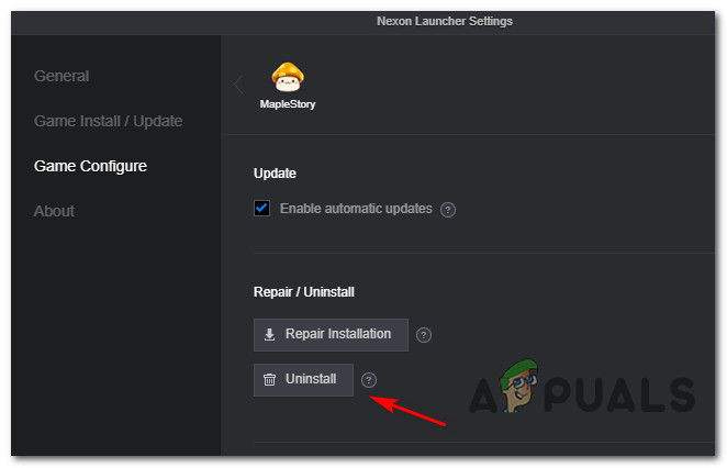 Accessing the Gear Icon associated with MapleStory - Next, once you’re inside the Nexon Launcher Settings associated with MapleStory, click on the Game Configure tab from the menu on the left, then click on the Uninstall button (under Repair / Uninstall).