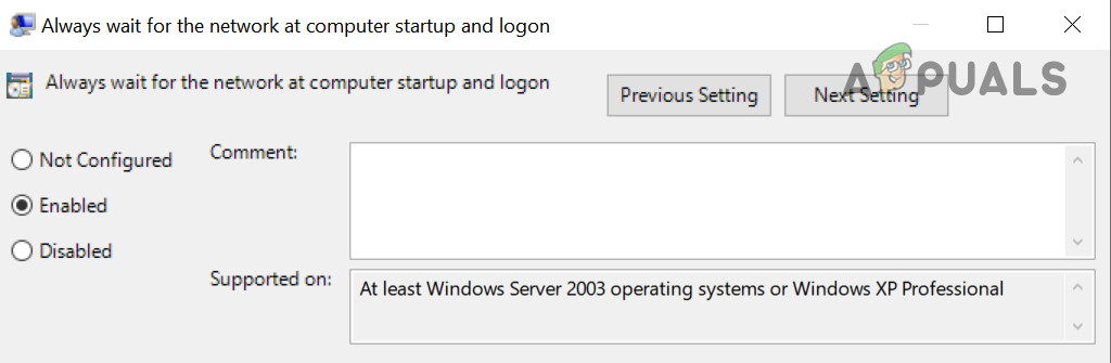 Open Always Wait for the Network at Computer Startup and Logon - Then change it to Enabled and click on Apply/OK.