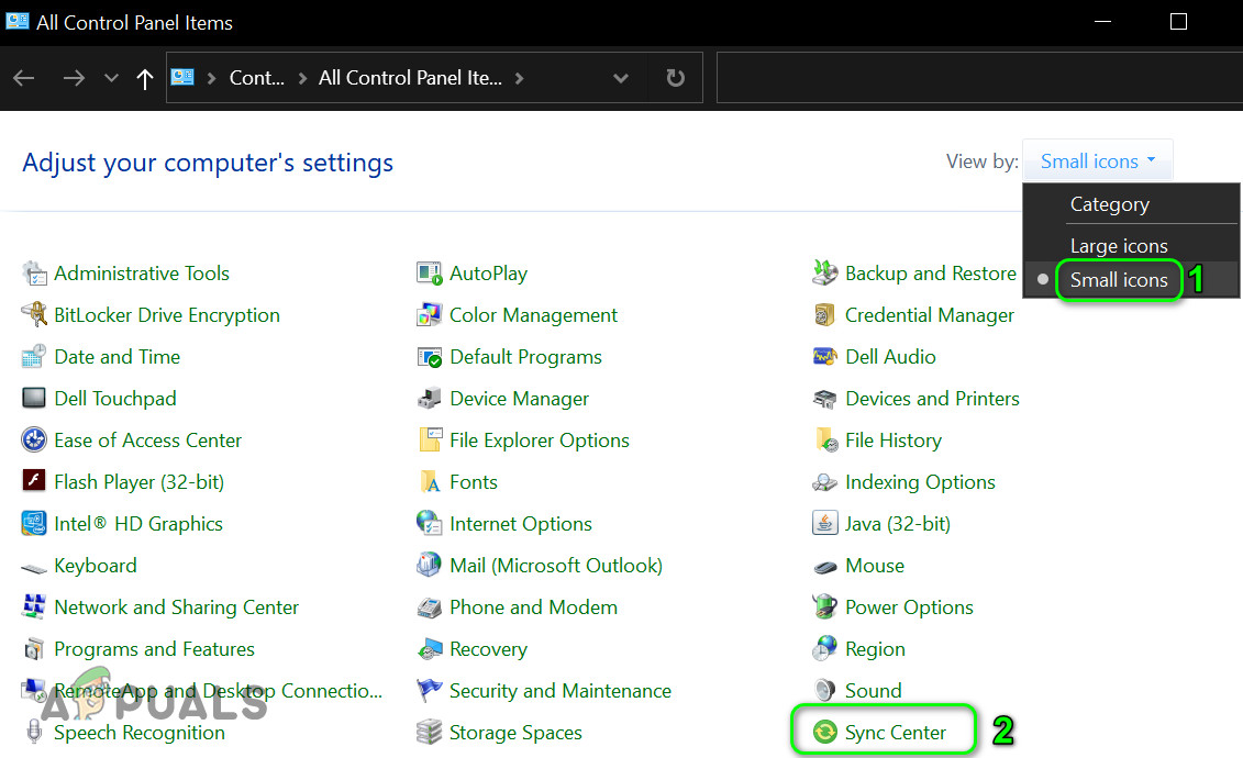 Open Control Panel - Now change the View by to Small Icons and select Sync Center.
