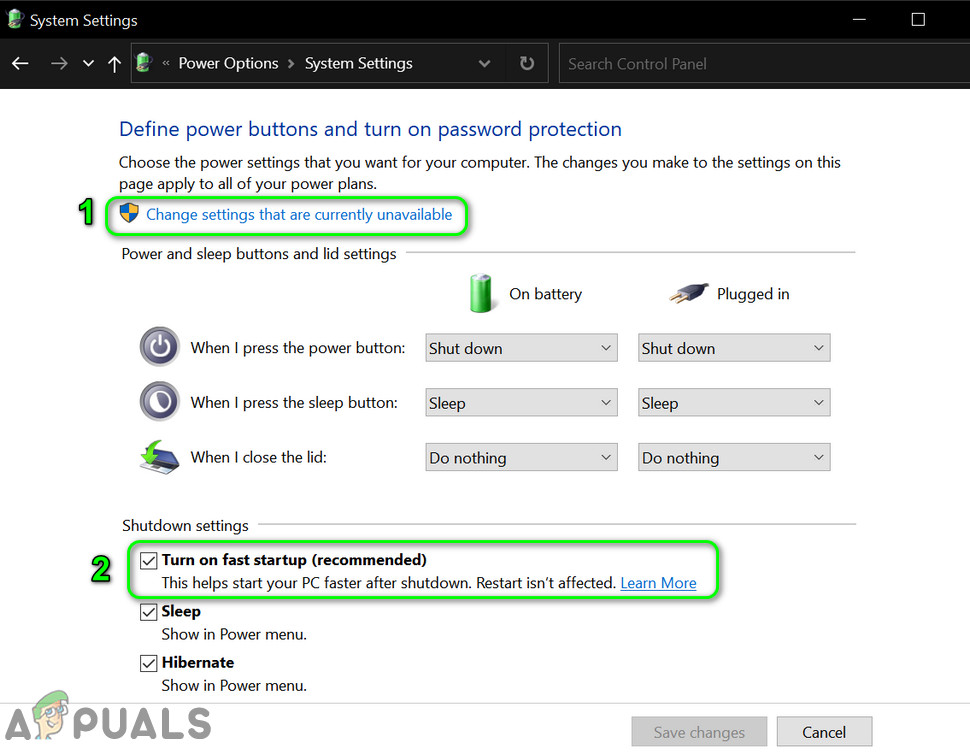 Open Choose a Power Plan - Now click on What the Power Buttons Do (in the left pane of the Control Panel window) and click on Change Settings That Are Currently Unavailable.