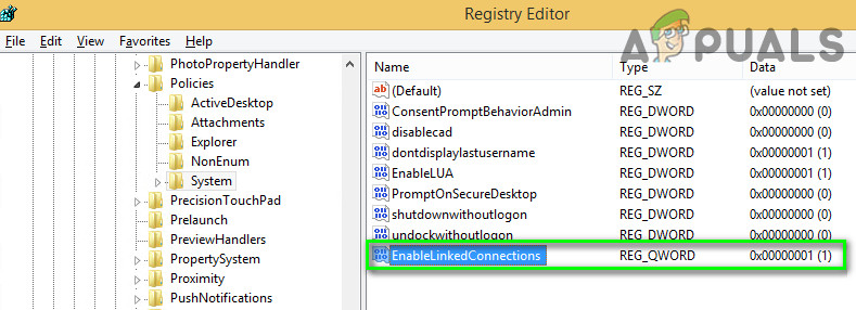 Create a DWORD (32-bit) Value named EnableLinkedConnctions and set its value to 1 at the following: