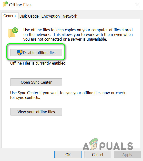 Open Manager Offline Files - Now click on Apply/OK and reboot your PC.