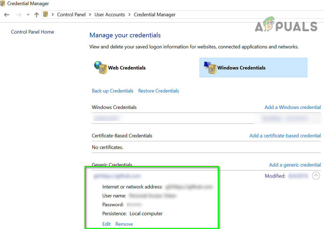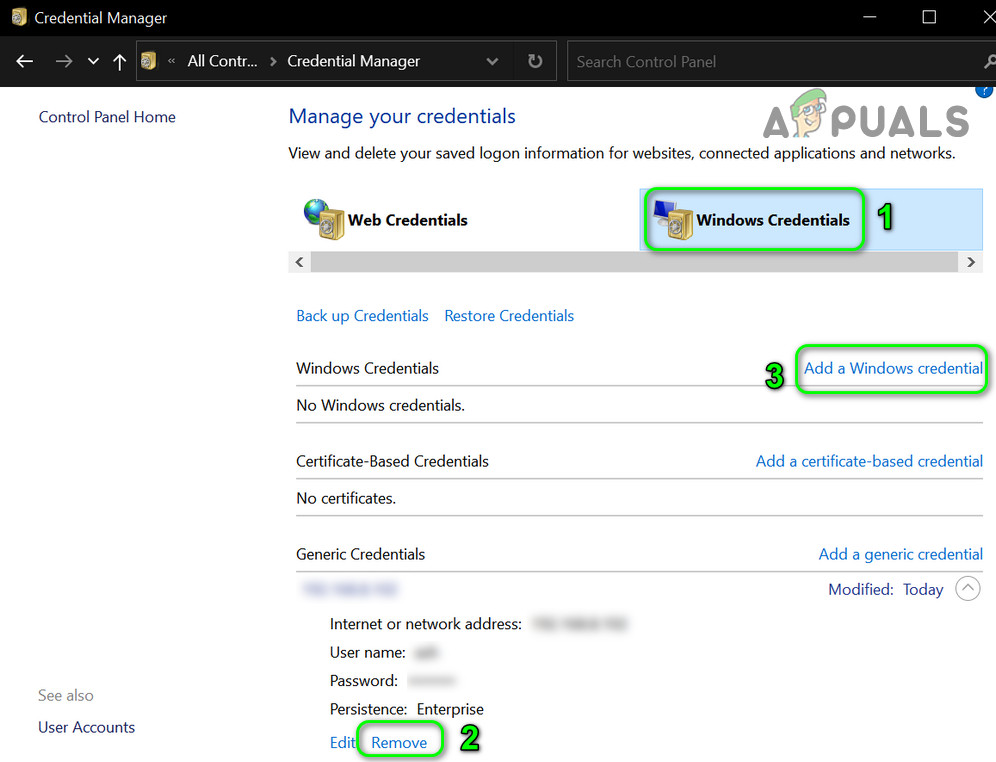 Remove the Network Credentials in the Credential Manager - Now reboot your PC and then navigate to the Windows Credentials tab of the Credential Manager (step 3 to 4).