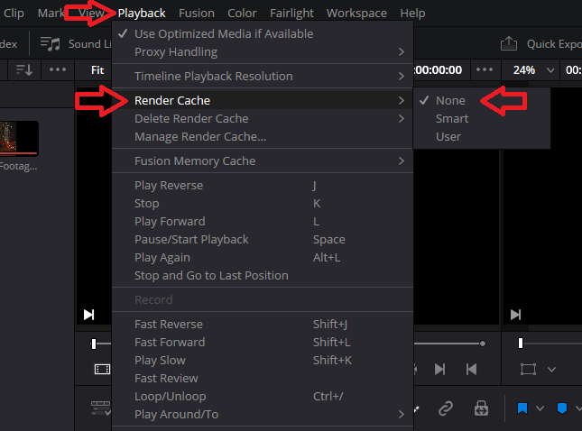 - Go to Playback in the top menu and select Render Cache → None.
