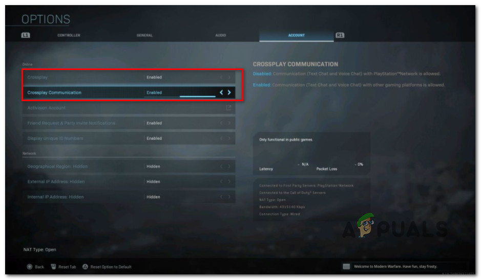 - Inside the Account tab, change the toggle of Crossplay from Enabled to Disabled and save the changes. Next, do the same with the Crossplay Communication toggle.