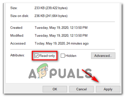 - Enabled Read-Only attribute – As it’s been confirmed by several affected users, this problem can also occur in the instance where some files involved in the operation are read-only, so the utility is unable to modify and override the files. In this case, you should be able to fix the problem by disabling the read-only attribute.