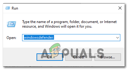- Press Windows key + R to open up a Run dialog box. Next, type ‘‘windowsdefender’ inside the run box and press Enter to open up the Windows Security menu.