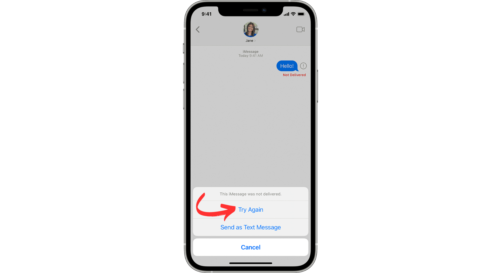 When you get a “message failed to send” error on your iPhone, simply tap the exclamation point next to the failed message and choose “Try Again.”