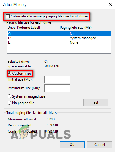 Opening Virtual Memory Settings - Remove the checkmark next to “Automatically manage paging file size for all drives“