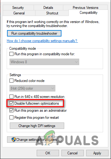 So, put a checkmark next to both “Run as administrator” and “Disable Fullscreen Optimizations” and then click Apply.