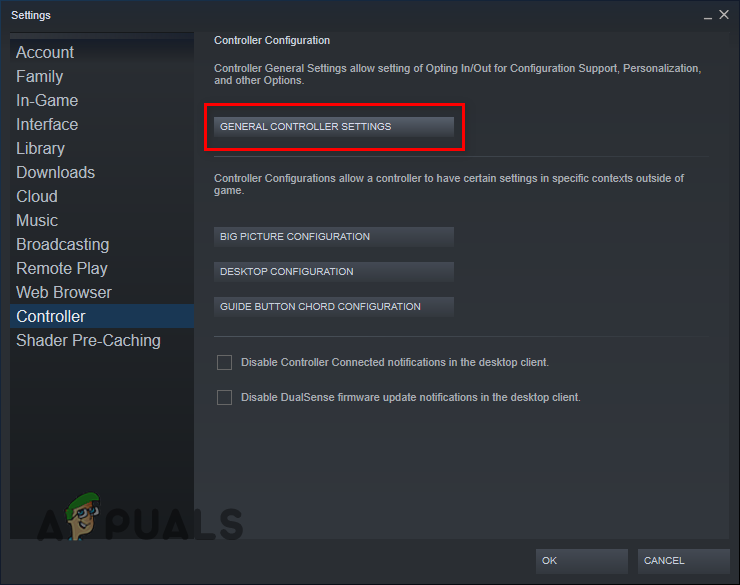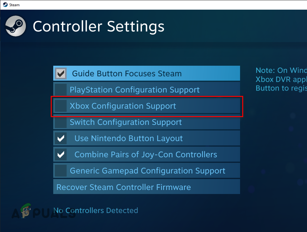 Opening General Controller Settings - Remove the checkmark present next to “Xbox Configuration Support.”
