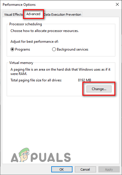 - Under Virtual Memory, click on the “Change…” option.