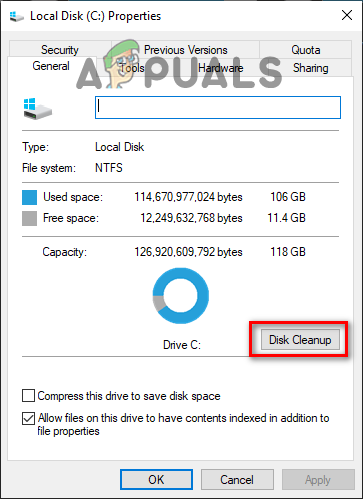 If your drives are extremely low on space, you should clean them up using the Windows Disk Cleanup tool. This will allow you to free up enough space to increase the Paging File Size. Ideally, your drives should have at least 25% of their total space available as free space. If they have less than that, perform a Disk Cleanup by following the steps listed below: