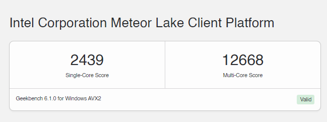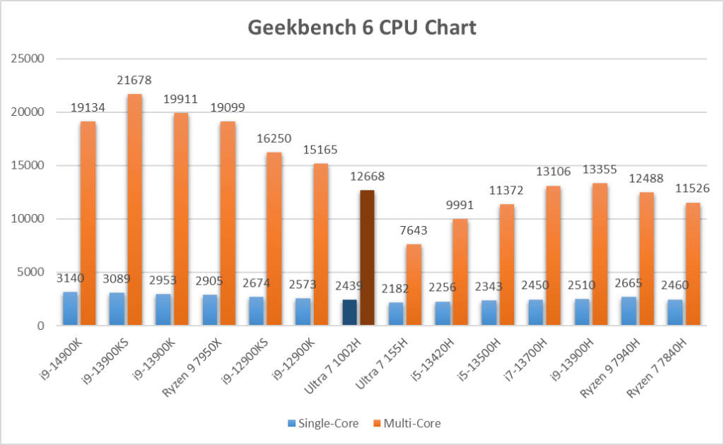 In Geekbench6, the Core Ultra 7 1002H scores 2439 points single-core wise and 12668 points in the multi-core department. This puts it ahead of the Ryzen 9 5950X (Desktop) by a small margin.