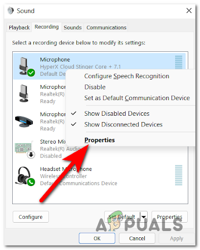 Access the Sound menu - Now that you are inside the Sound menu, select the Recording section and right-click on the microphone you use, then click on Properties.