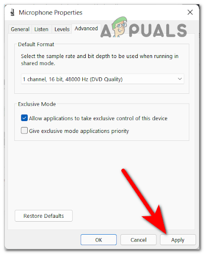 - After that, make sure to enable, disable and enable again the Allow applications to take exclusive control of this device option. Leave the option enabled and click on Apply.