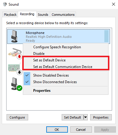 - Right-click it and select Set as Default Device and Set as Default Communication Device.