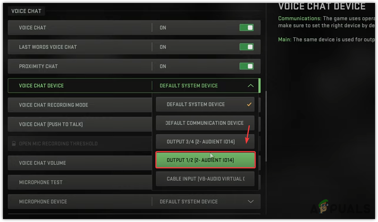 - Once done, change your voice chat device from the default system device to your microphone device.
