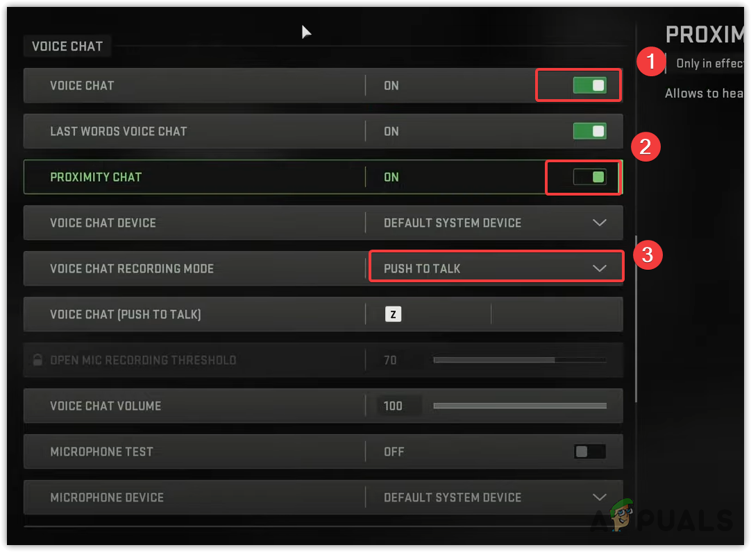 - Voice chat and proximity chat should be enabled. If they are set to enabled, disable them and re-enable them.