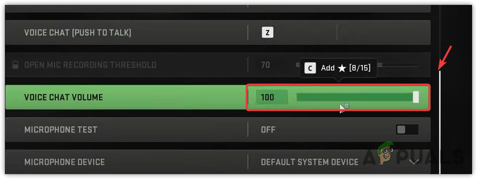 - Scroll down a little bit, make sure the voice chat volume is up, then select your Microphone device by clicking the dropdown menu of Microphone Device.
