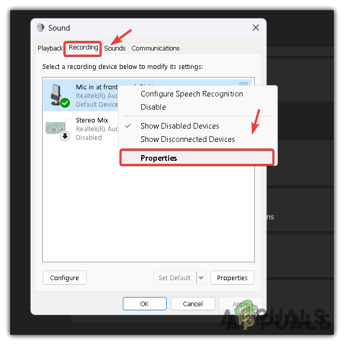 - Here, right-click the microphone device and select Properties.