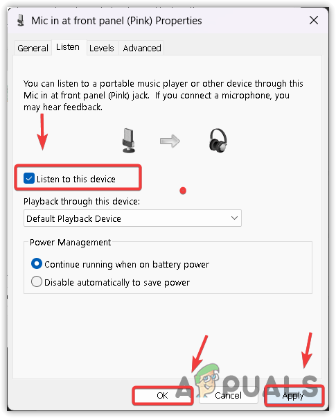 - Click Apply and see if you can listen to yourself.