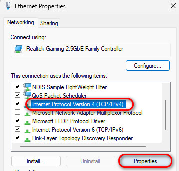 - Select Internet Protocol Version 4 (TCP/IPv4) and click Properties.