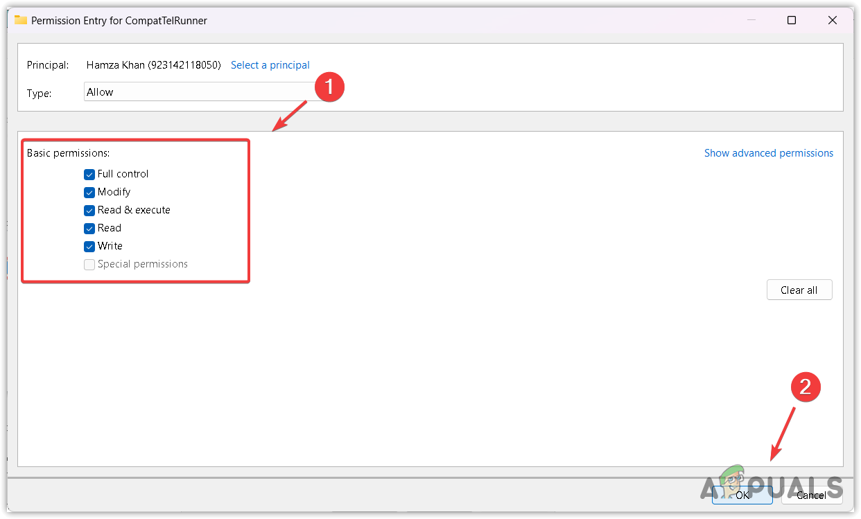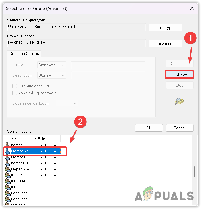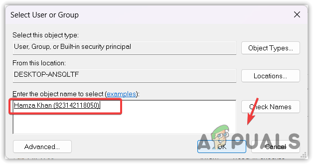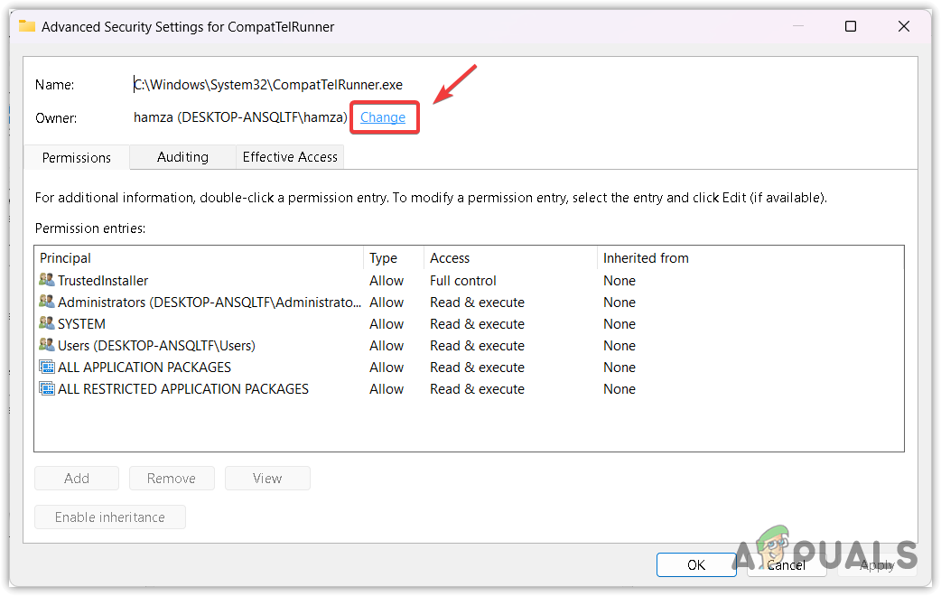 - Then, click Change and type the username of the logged account to transfer the permissions.